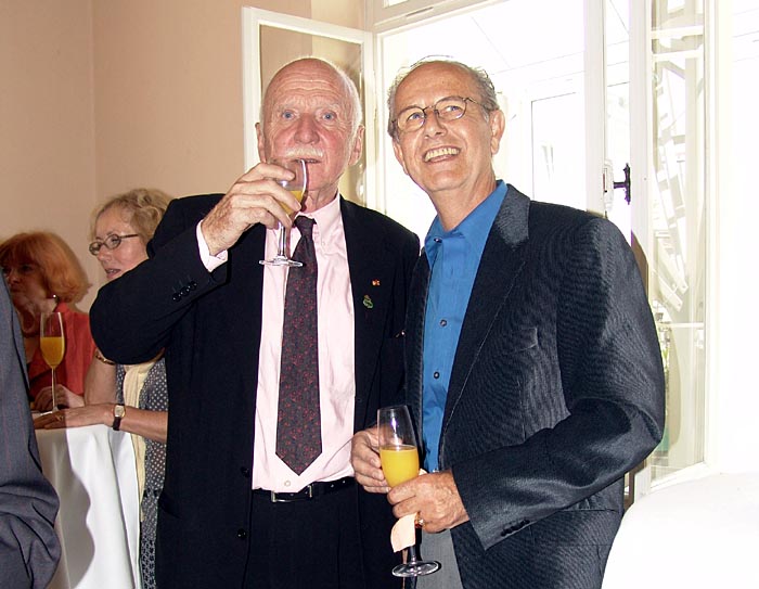 Nach dem Festakt auf der Bühne gab es bei Sekt und kleinen Speisen zahlreiche Anlässe zu Gesprächen. Auf den folgenden beiden Bildern Peter Stoltzenberg im Gespräch mit dem jetzigen Operndirektor Bernd Feuchtner und dem Begründer der Schlossfestspiele 1975 Helmut Hein. Weitere Aufnahmen zeigen Ehemalige des Tanztheaters und des Schauspiels und Stoltzenberg im Kreis zahlreicher Gratulanten. Die meisten davon Künstler und Mitarbeiter aus seiner Zeit. |